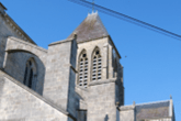 Au milieu du transept, s’élève le clocher majestueux bâti sur un plan rectangulaire. Ses grandes faces (est et ouest) sont percées de 3 fenêtres et les autres faces de 2 fenêtres de même style que les autres fenêtres de l’édifice. le clocher est surmonté d’une flèche en charpente de 13 m. de haut en forme de parallélogramme avec une croix de 4 mètres de haut avec un coq à son extrémité. Il abrite 3 cloches que l’on peut voir ci-après à toute volée, après un petit moment de carillon.